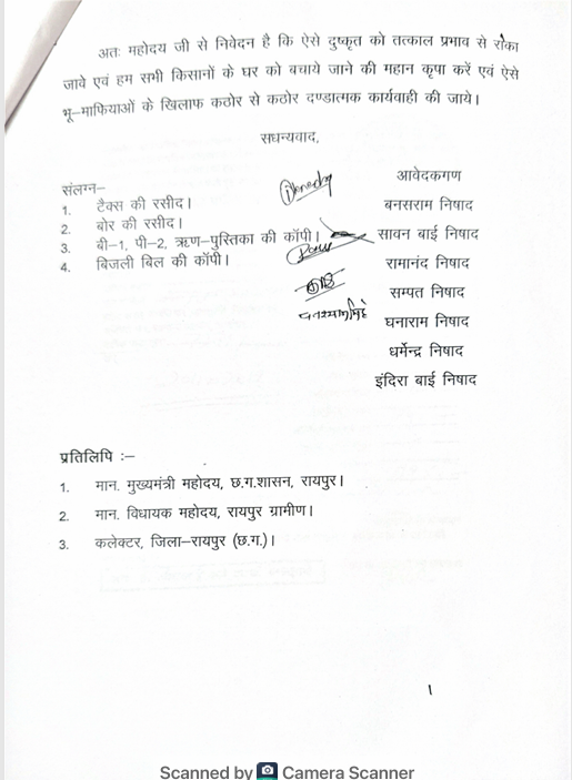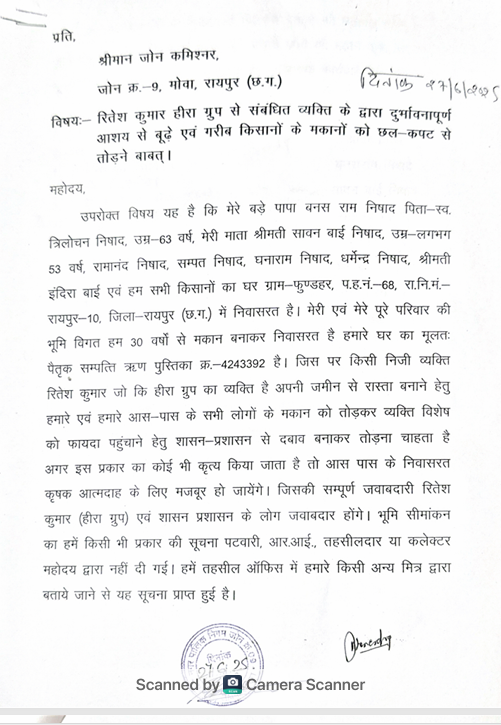 उनका कहना है कि यह सब एक खास व्यक्ति को फायदा पहुंचाने के उद्देश्य से किया जा रहा है। किसानों के अनुसार, वे पिछले लगभग 30 वर्षों से उसी भूमि पर अपने पैतृक मकानों में निवास कर रहे हैं, जिसके वैध दस्तावेज ऋण पुस्तिका क्रमांक 4243392 उनके पास मौजूद हैं। उनका दावा है कि अब तक न तो पटवारी, न आर.आई., न तहसीलदार और न ही कलेक्टर कार्यालय की ओर से कोई सीमांकन या निर्माण हटाने की आधिकारिक सूचना दी गई है। यह जानकारी उन्हें केवल एक मित्र के माध्यम से तहसील कार्यालय में अनौपचारिक रूप से मिली। प्रभावित परिवारों में बनस राम निषाद, श्रीमती सावन बाई निषाद, रामानंद निषाद, सम्पत निषाद, घनाराम निषाद, धर्मेन्द्र निषाद और श्रीमती इंदिरा बाई समेत कई स्थानीय किसानों ने प्रशासन से इस कार्रवाई को रोकने की मांग की है। उन्होंने चेतावनी दी कि यदि उनके घरों को तोड़ा गया, तो वे आत्मदाह जैसा कठोर कदम उठाने के लिए बाध्य होंगे, जिसकी संपूर्ण जिम्मेदारी रितेश कुमार एवं संबंधित अधिकारियों की होगी। कल पीड़ित किसानों ने इस मामले को लेकर ग्रामीण विधायक मोतीलाल साहू और रायपुर कलेक्टर को भी ज्ञापन सोपा है एवं किसानों ने जिला प्रशासन से मांग की है कि इस अन्यायपूर्ण कृत्य को तत्काल प्रभाव से रोका जाए और भू-माफियाओं के खिलाफ सख्त से सख्त कार्रवाई की जाए, ताकि गरीब और पिछड़े वर्ग के लोगों के अधिकारों की रक्षा हो सके।