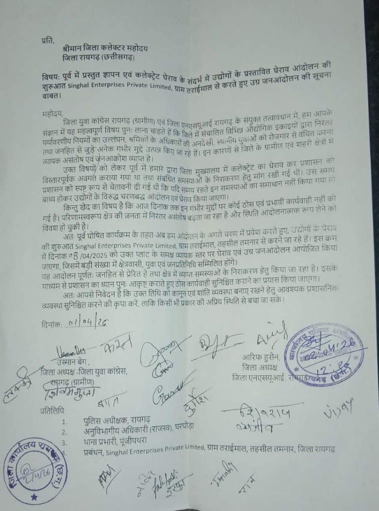 रायगढ़ (गौरी शंकर गुप्ता)। जिले में औद्योगिक इकाइयों के खिलाफ स्थानीय रोजगार, पर्यावरण प्रदूषण, श्रमिक सुरक्षा और जनहित के मुद्दों को लेकर अब आंदोलन तेज होने जा रहा है। जिला युवा कांग्रेस (ग्रामीण) अध्यक्ष उस्मान बेग एवं जिला एनएसयूआई अध्यक्ष आरिफ हुसैन के नेतृत्व में 08 अप्रैल से चरणबद्ध जनआंदोलन की शुरुआत की जाएगी। पहले चरण में ग्राम तराईमाल स्थित सिंघल एंटरप्राइजेज प्राइवेट लिमिटेड प्लांट का घेराव और प्रदर्शन किया जाएगा।