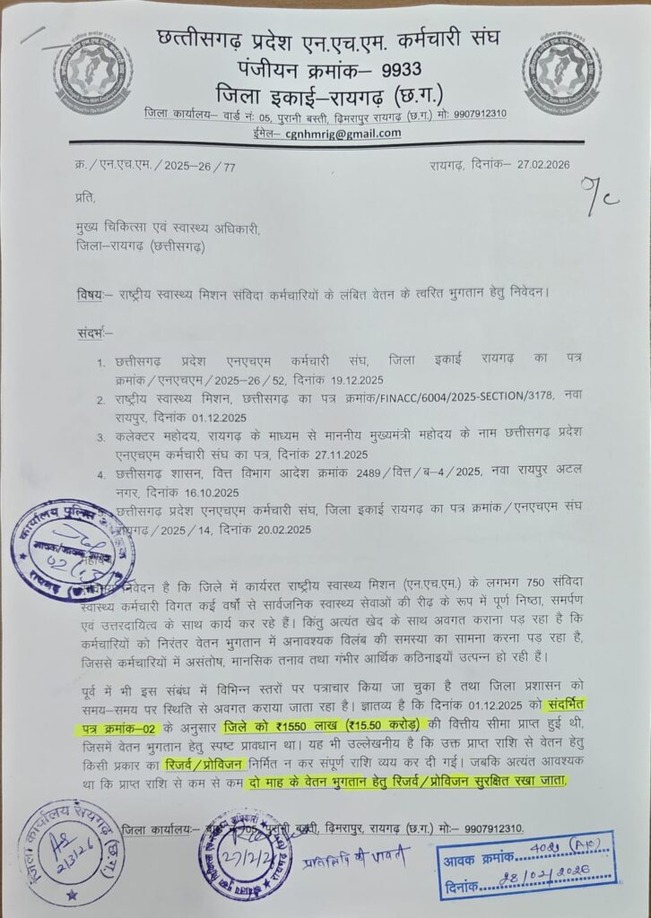 संघ पदाधिकारियों ने 27 फरवरी 2026 को मुख्य चिकित्सा एवं स्वास्थ्य अधिकारी कार्यालय पहुंचकर वेतन भुगतान में हो रहे विलंब से अवगत कराया और समाधान की मांग की। साथ ही जनप्रतिनिधियों को भी इस संबंध में ज्ञापन सौंपे जाने की जानकारी दी गई है।