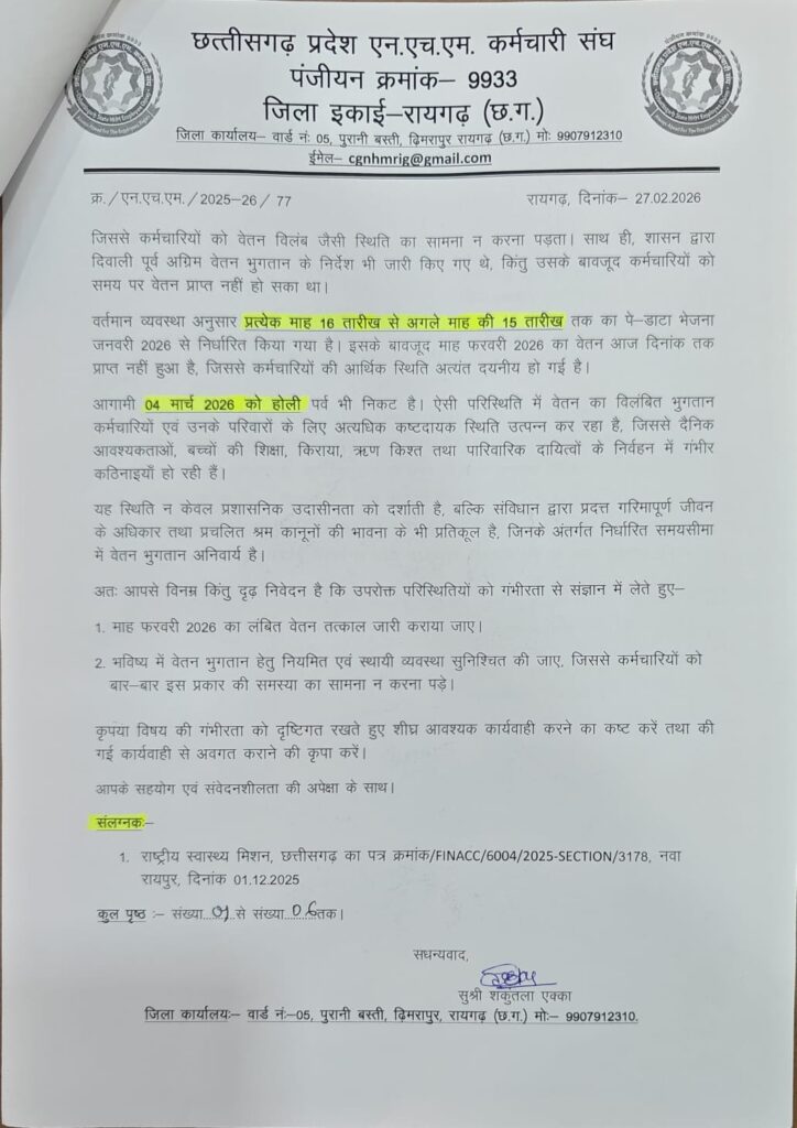 घरघोड़ा(गौरी शंकर गुप्ता)। जिले में कार्यरत राष्ट्रीय स्वास्थ्य मिशन (एनएचएम) के संविदा कर्मचारियों को फरवरी 2026 का वेतन अब तक प्राप्त नहीं हुआ है। वेतन भुगतान में देरी के कारण कर्मचारियों में असंतोष है और उन्होंने शीघ्र भुगतान की मांग की है।