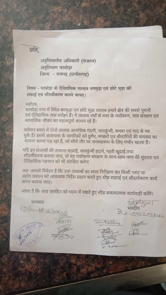 घरघोड़ा (गौरी शंकर गुप्ता)। नगर के ऐतिहासिक बगमूड़ा एवं छोटे मुड़ा तालाबों की बिगड़ती स्थिति को लेकर नगरवासियों ने एकजुट होकर प्रशासन का ध्यान आकर्षित किया। नागरिकों ने अनुविभागीय अधिकारी (राजस्व) तथा मुख्य नगर पालिका अधिकारी, नगर पंचायत घरघोड़ा को ज्ञापन सौंपकर तालाबों की शीघ्र सफाई और सौंदर्यीकरण की मांग की है।