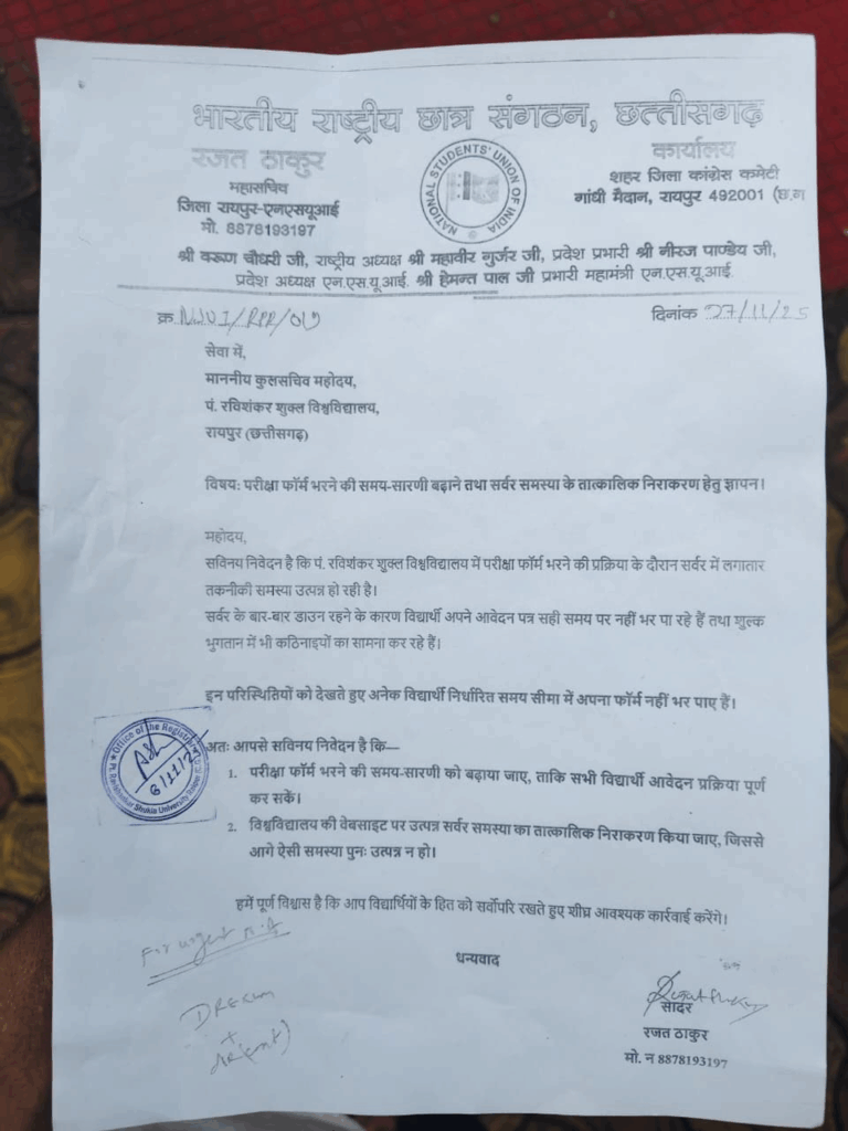 रायपुर। पं. रविशंकर शुक्ल विश्वविद्यालय रायपुर में परीक्षाओं के लिए आवेदन प्रारंभ कर दिए गए हैं। परीक्षा फॉर्म भरने की प्रक्रिया के दौरान लगातार सर्वर समस्या उत्पन्न होने से विद्यार्थी वर्ग में भारी असंतोष व्याप्त है। सर्वर के बार-बार डाउन रहने के कारण छात्र-छात्राएँ अपने आवेदन पत्र सही समय पर नहीं भर पा रहे हैं तथा शुल्क भुगतान में भी कठिनाइयों का सामना कर रहे हैं। इन्हीं समस्याओं को ध्यान में रखते हुए एनएसयूआई के प्रतिनिधिमंडल ने कुलसचिव से मिलकर ज्ञापन सौंपा और संगठन ने अंतिम तिथि बढ़ाने और वेबसाइट संबंधित समस्या का निराकरण करने की मांग की है।